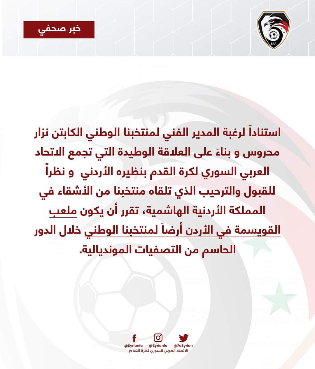 جاء ذلك من خلال خبر صحفي نشره الموقع الرسمي للاتحاد السوري لكرة القدم، مبيناً فيه أنه وبناءً على رغبة المدير الفني للمنتخب السوري نزار محروس، باختيار ملاعب المملكة لاستضافة مباريات " نسور قاسيون " في المرحلة المقبلة بالتصفيات.