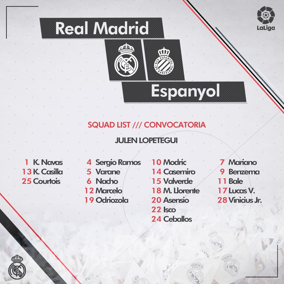 واستدعى لوبتيجى 20 لاعبا لمواجهة إسبانيول، والتى شهدت غياب الثنائي تونى كروس نجم خط وسط الفريق بالإضافة إلى الظهير الايمن دانى كارفخال، بقرار فنى من أجل إراحتهم، بينما تواجد النجم البرازيلى الشاب فينيسيوس جونيور.