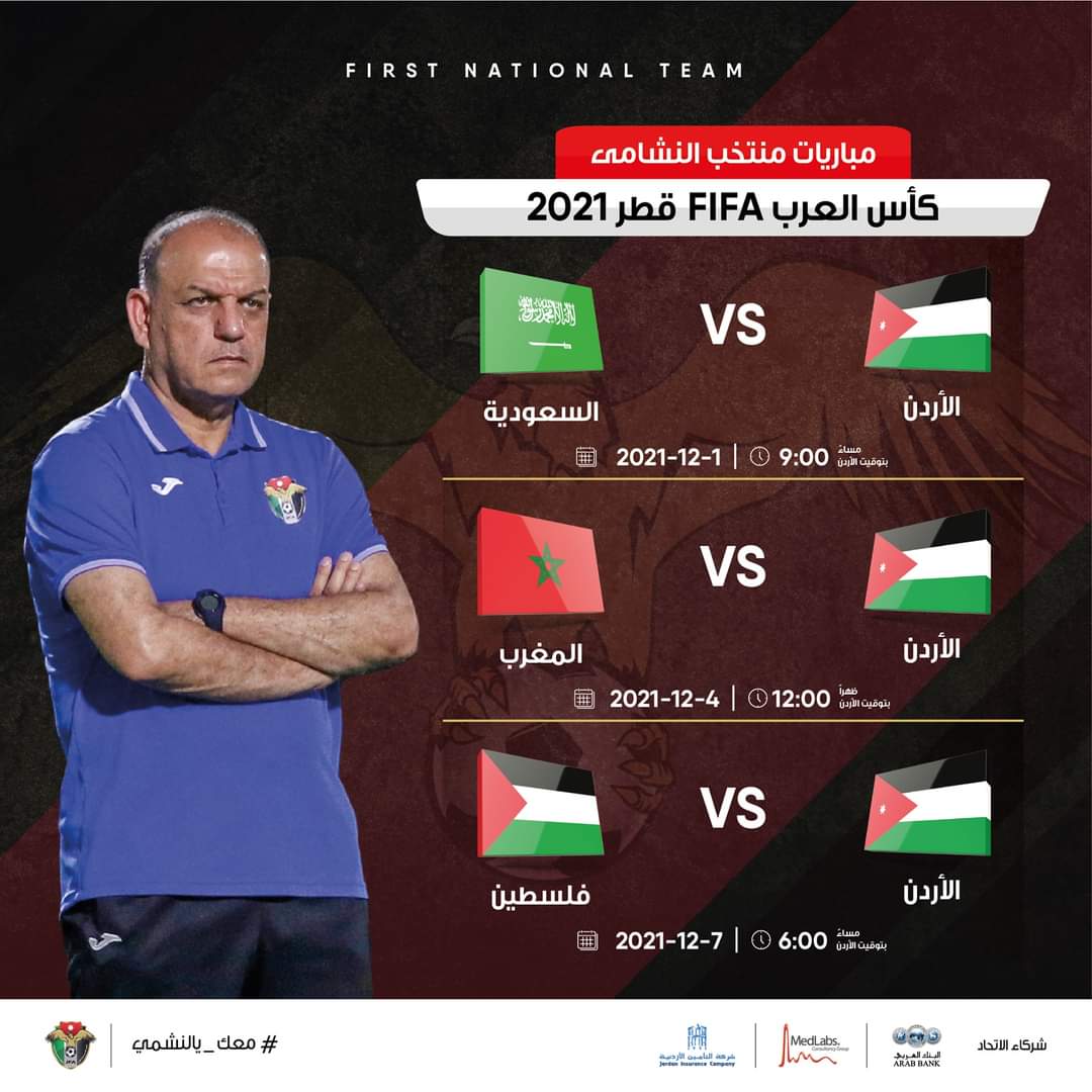 ويفتح المنتخب الوطني مشواره في البطولة بلقاء المنتخب السعودي في الأول من شهر كانون الأول/ديسمبر، على أن يواجه منتخب المغرب في الجولة الثانية يوم الرابع من الشهر نفسه، ويختتم مباريات دور المجموعات بلقاء فلسطين يوم السابع من الشهر ذاته.