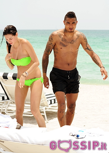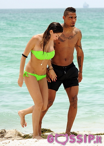 فضل لاعب وسط نادي ميلان الايطالي الدولي الغاني كيفن برينس بواتينغ قضاء إجازته السنوية رفقة صديقته الإيطالية الأميركية ميليسا ساتا على شواطىء مدينة ميامي الأمريكية على متابعة زملائه في الروسونيري خلال بطولة يورو 2012
