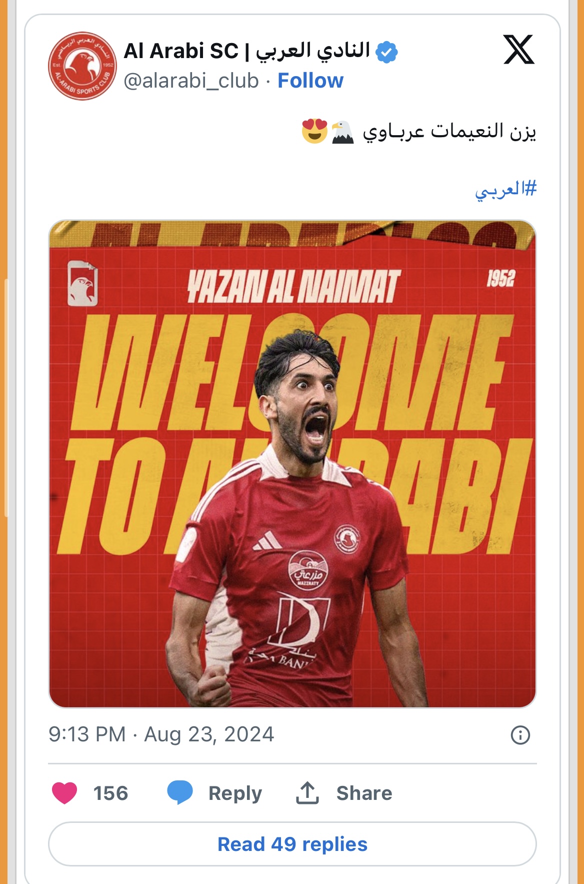 أعلن نادي العربي القطري التعاقد مع اللاعب الأردني يزن النعيمات للعب في صفوف فريق كرة القدم خلال المرحلة المقبلة.وكتب النادي عبر حسابه الرسمي في x:"يزن النعيمات عربـاوي"