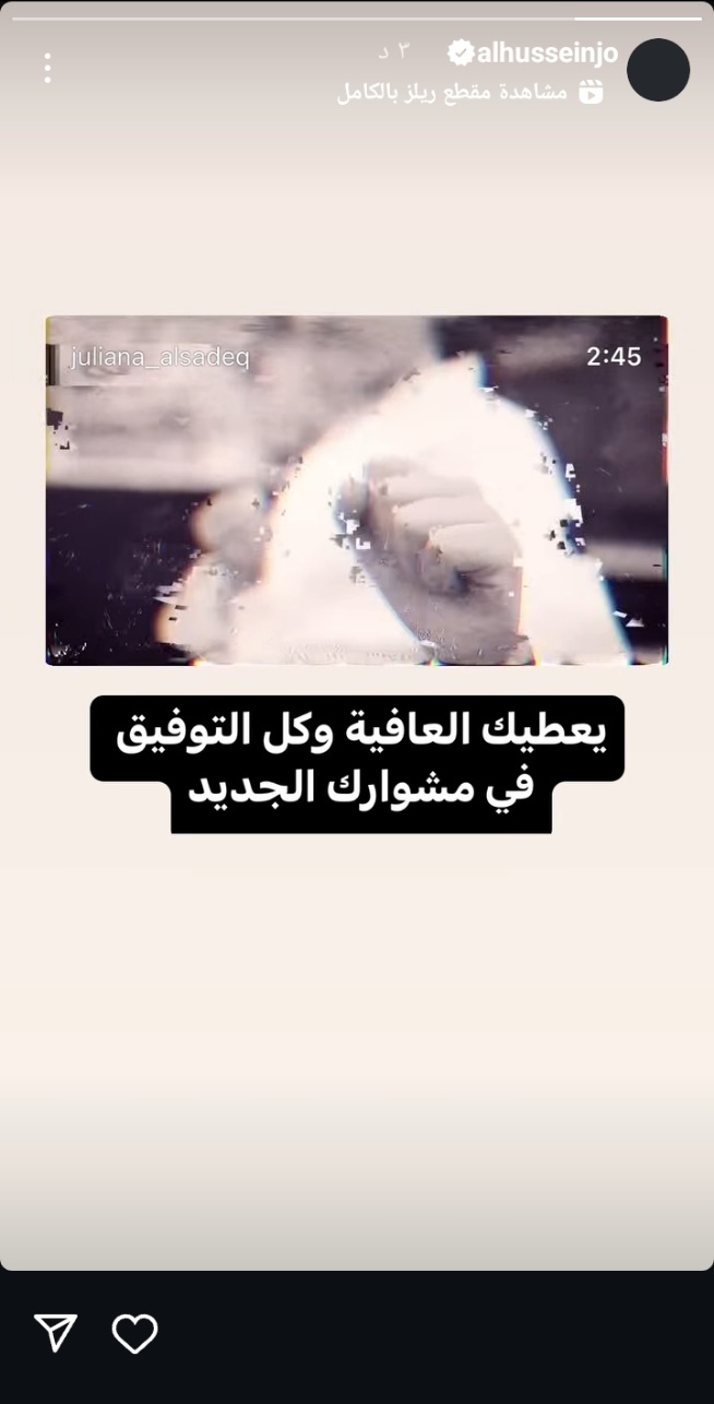 ونشر سموه عبر خاصية "ستوري" على صفحته الشخصية عبر موقع التواصل الاجتماعي "إنستغرام" مقطع فيديو نشرته الصادق عبر حسابها في انستغرام معلقا عليها: "يعطيك العافية.. وكل التوفيق في مشوارك الجديد".
