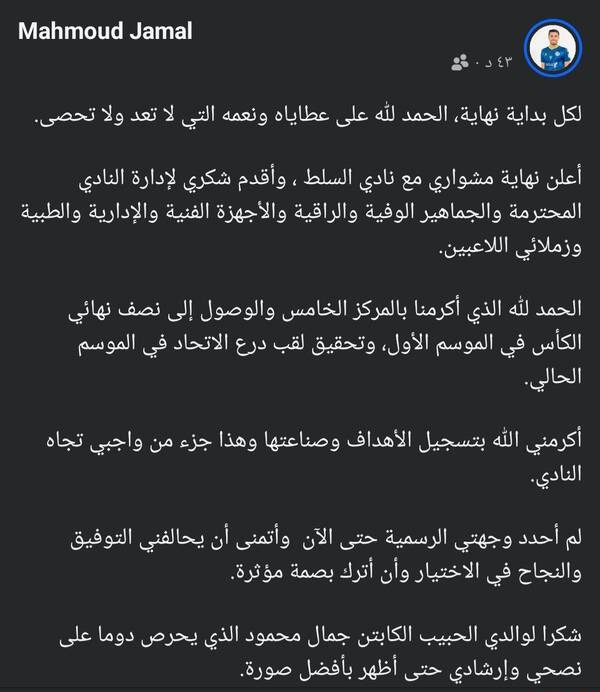 وكتب محمود جمال عبر صفحته الشخصية عبر موقع "فيسبوك" : "لكل بداية نهاية، الحمد لله على عطاياه ونعمه التي لا تعد ولا تحصى، أعلن نهاية مشواري مع نادي السلط، وأقدم شكري لإدارة النادي المحترمة والجماهير الوفية والراقية والأجهزة الفنية والإدارية والطبية وزملائي اللاعبين".