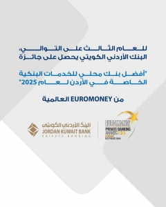 تقديراً لأدائه المتميز وخدماته الاستثنائية في مجال إدارة الثروات والخدمات المصرفية الخاصة، أعلن البنك الأردني الكويتي عن فوزه بجائزة "أفضل بنك للخدمات البنكية الخاصة في الأردن لعام 2025" من مجلة يوروموني العالمية .