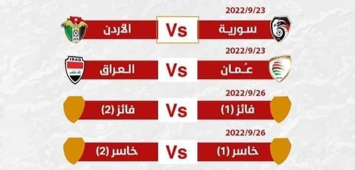 وبحسب جدول ونظام البطولة، يخوض النشامى المواجهة الأولى في 23 أيلول أمام المنتخب السوري، ويلتقي العراق مع عُمان على الطرف الآخر، على أن يشهد يوم 26 من الشهر ذاته لقاء تحديد البطل والذي يجمع الفائز من المباراتين، إلى جانب مواجهة تحديد صاحب المركز الثالث.