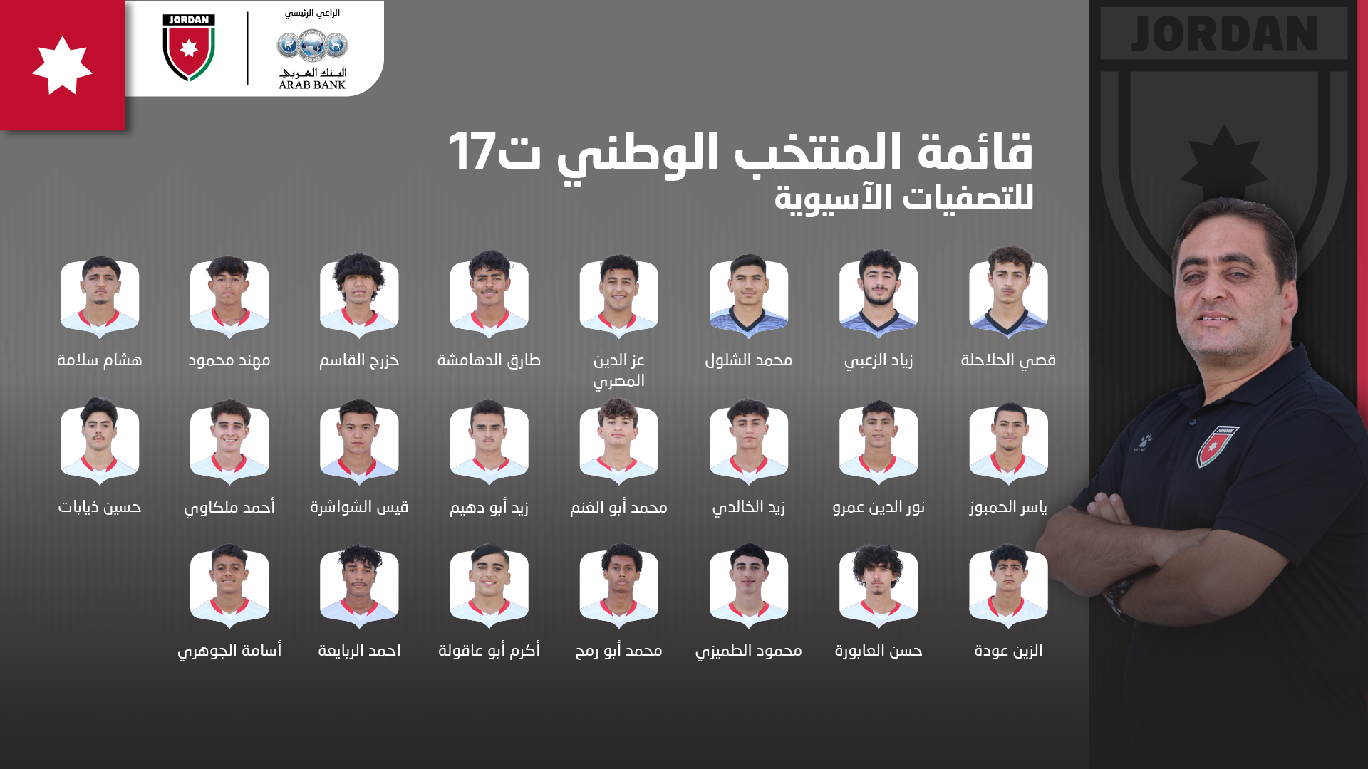 أعلن المنتخب الوطني ت17 بقيادة المدرب عبدالله القططي، قائمة ضمت 23 لاعباً تأهبا للمشاركة بالتصفيات الآسيوية التي يستضيفها الاتحاد الأردني من 19 حتى 27 تشرين الأول الجاري.